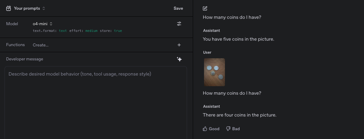 Мы начали с того, что попросили o3 и o4-mini посчитать количество монет на изображении. Мы задали модели вопрос «Сколько у меня монет?» с следующим изображением: