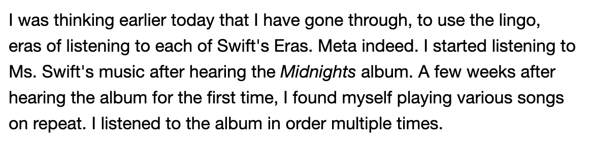I was thinking earlier today that I have gone through, to use the lingo, eras of listening to each of Swift’s Eras. Meta indeed. I started listening to Ms. Swift’s music after hearing the Midnights album. A few weeks after hearing the album for the first time, I found myself playing various songs on repeat. I listened to the album in order multiple times.