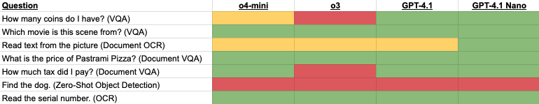 o4-mini прошел четыре из семи тестов. o3 Mini прошел три из семи тестов. Производительность обеих моделей рассуждения была хуже, чем у GPT-4.1 и GPT-4.1 Nano, новейших мультимодальных моделей OpenAI. GPT-4.1 и GPT-4.1 Nano не обладают способностями к рассуждению.