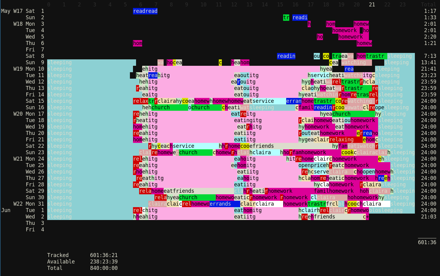 Планировщик времени и задач, написанный на Ruby. Он позволяет быстро фиксировать текущие действия в формате простых напоминаний («Что я делал?») и сохранять их в текстовый файл. Проект был создан в 2013 году Бреттом Терпстрой — бывшим разработчиком Oracle и автором десятков open source-приложений, включая консольные утилиты вроде mdless (просмотрщик markdown-файлов).