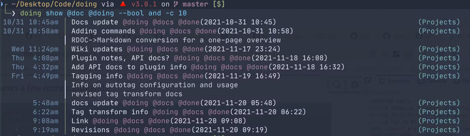 Изначально Doing представлял собой простой bash-скрипт на 20 строк, но со временем «оброс» функциональностью. К 2020 году в Doing была реализована поддержка тегов для организации записей, система заметок к задачам, а также интеграция с LaunchBar.