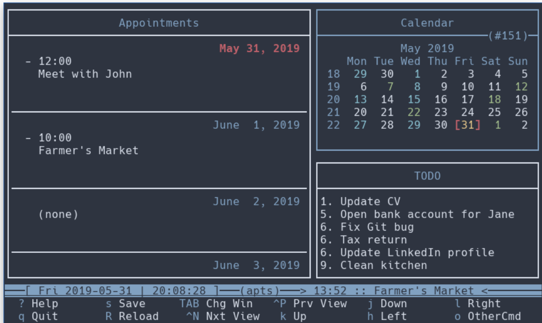 Текстовый органайзер и календарь для Linux и Unix-подобных операционных систем. В 2004 году астрофизик Фредерик Куло разработал этот инструмент под свои нужды, пока писал докторскую диссертацию. Он передал его в open source и развивал вплоть до 2010 года. Затем проект перешёл к учёному Лукасу Фляйшеру, а с 2017 года мейтенером стал Ларс Хенриксен — именно при нём появились ключевые функции.