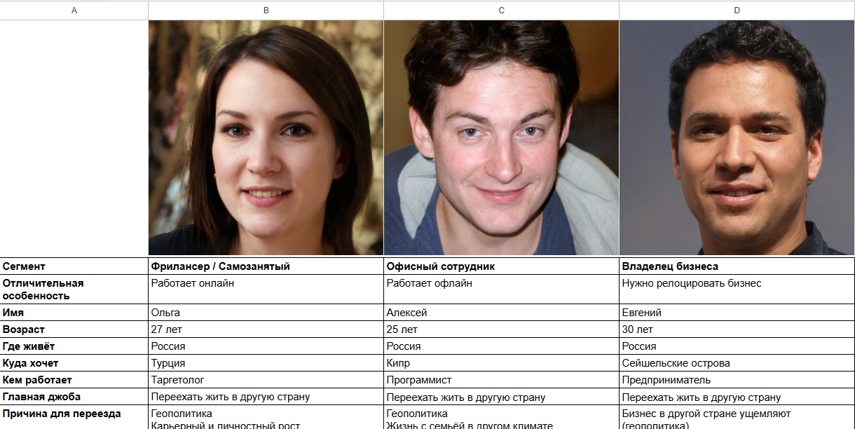 Таблица с описанием типов потенциальных пользователей. Это поможет правильно сегментировать ЦА и определить ключевые группы потребителей для MVP.