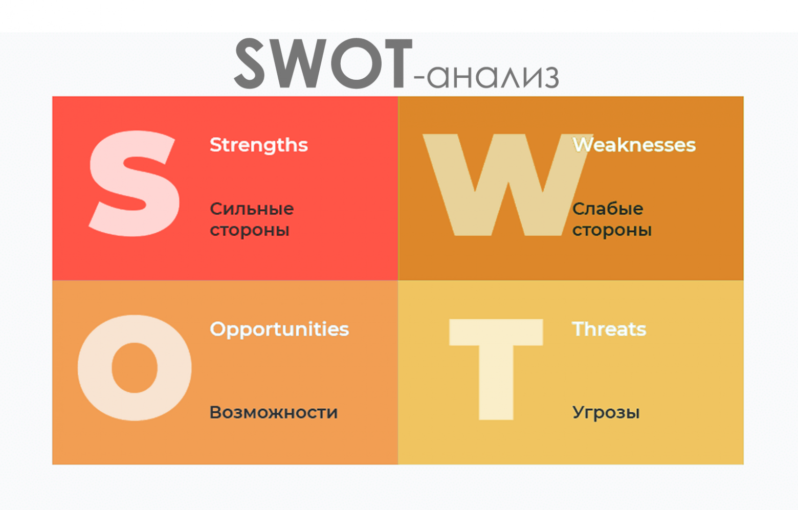 Threats — угрозы. Какие внешние факторы могут помешать успеху? Например, новые конкуренты, экономические кризисы или негативные изменения на рынке.