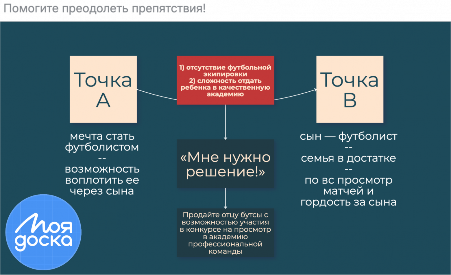 То есть клиентам не нужны футбольные бутсы как таковые. Они нужны отцу 9-летнего ребенка, чтобы реализовать через него свою детскую мечту становления профессиональным футболистом. А еще хорошим отцом.