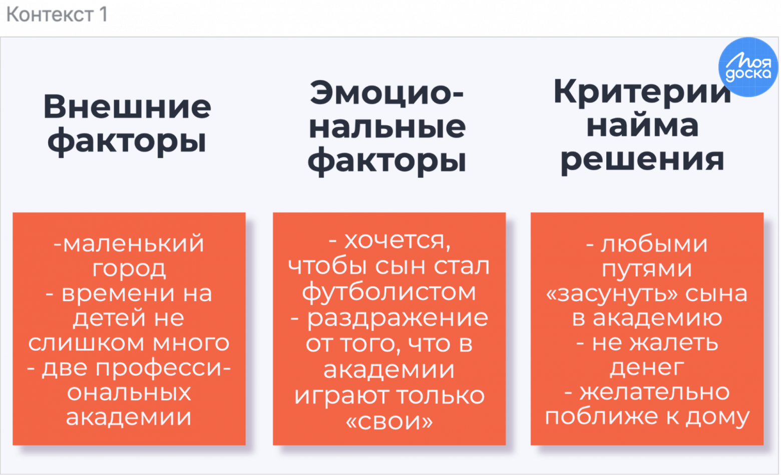 В этом случае у отца есть JTBD — потребность в спортивном воспитании сына. Для того, чтобы воспитать сына нужным образом, отец нанимает себе в помощь решение.