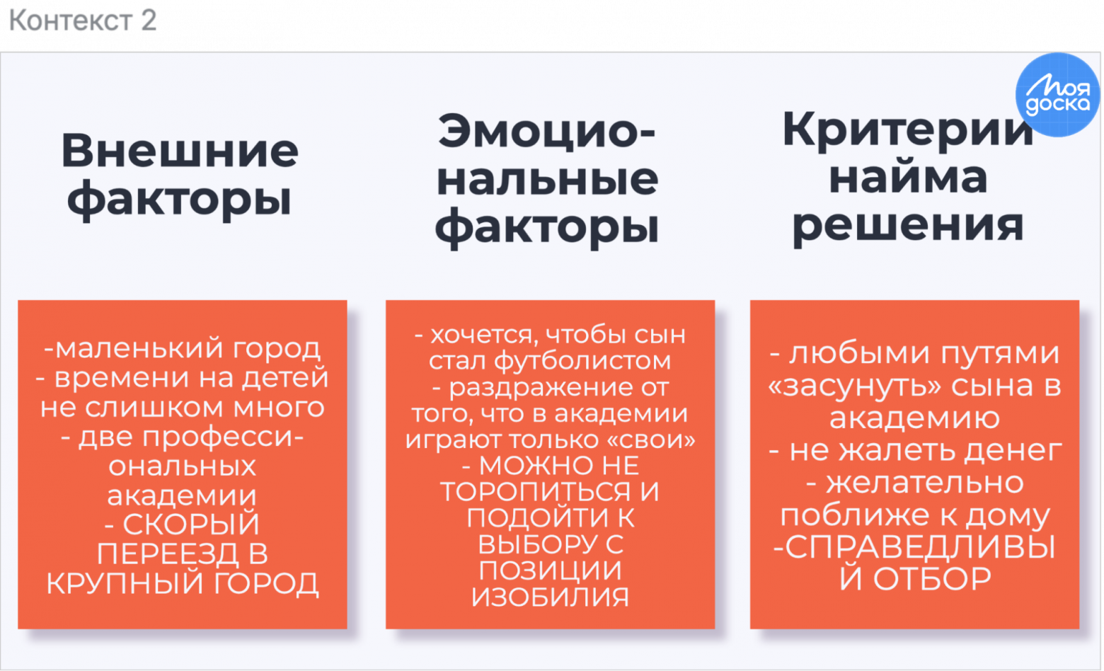 Согласно JTBD, именно контекст определяет выбор человека. У всех нас периодически возникают задачи, решение которым мы ищем, исходя из ситуации, в которой находимся. Переходя от контекста к контексту, будет меняться и решение казалось бы одинаковой проблемы.