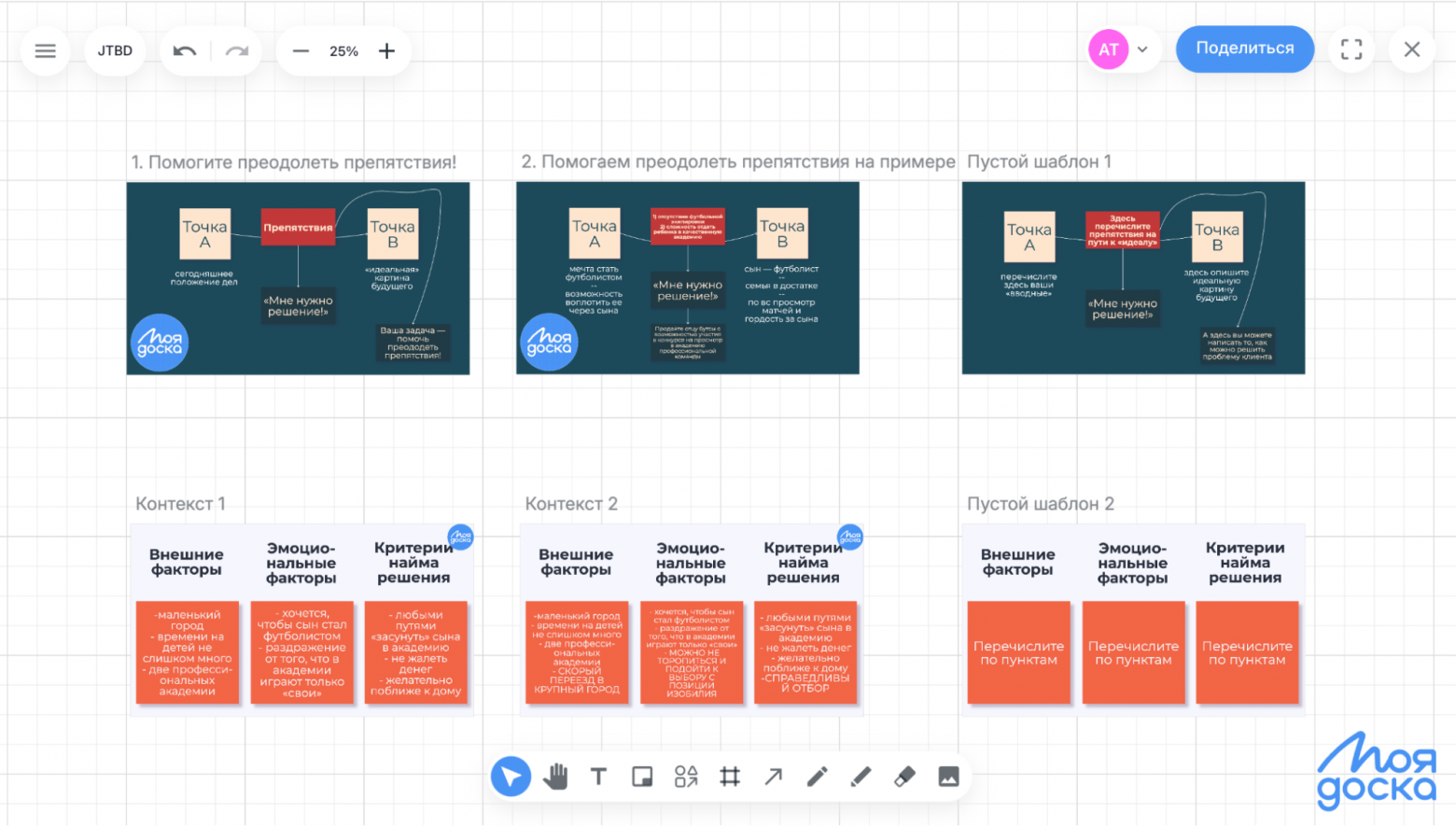 Онлайн‑доски. Инструмент, который сочетает в себе и простоту маркерной доски, и полноту функционала для дизайнеров. Среди них — МояДоска, на которой в онлайн‑формате можно создать JTBD своего клиента и поделиться этой доской со своей командой, начальником или близкими