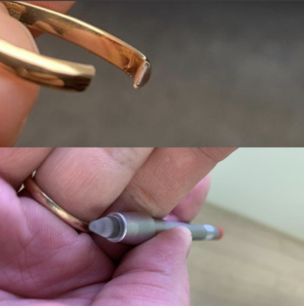 2. С внутренней стороны кольца делают небольшой надпил и капают реактив. Часто бывает, что надпилы не достают до вставки.