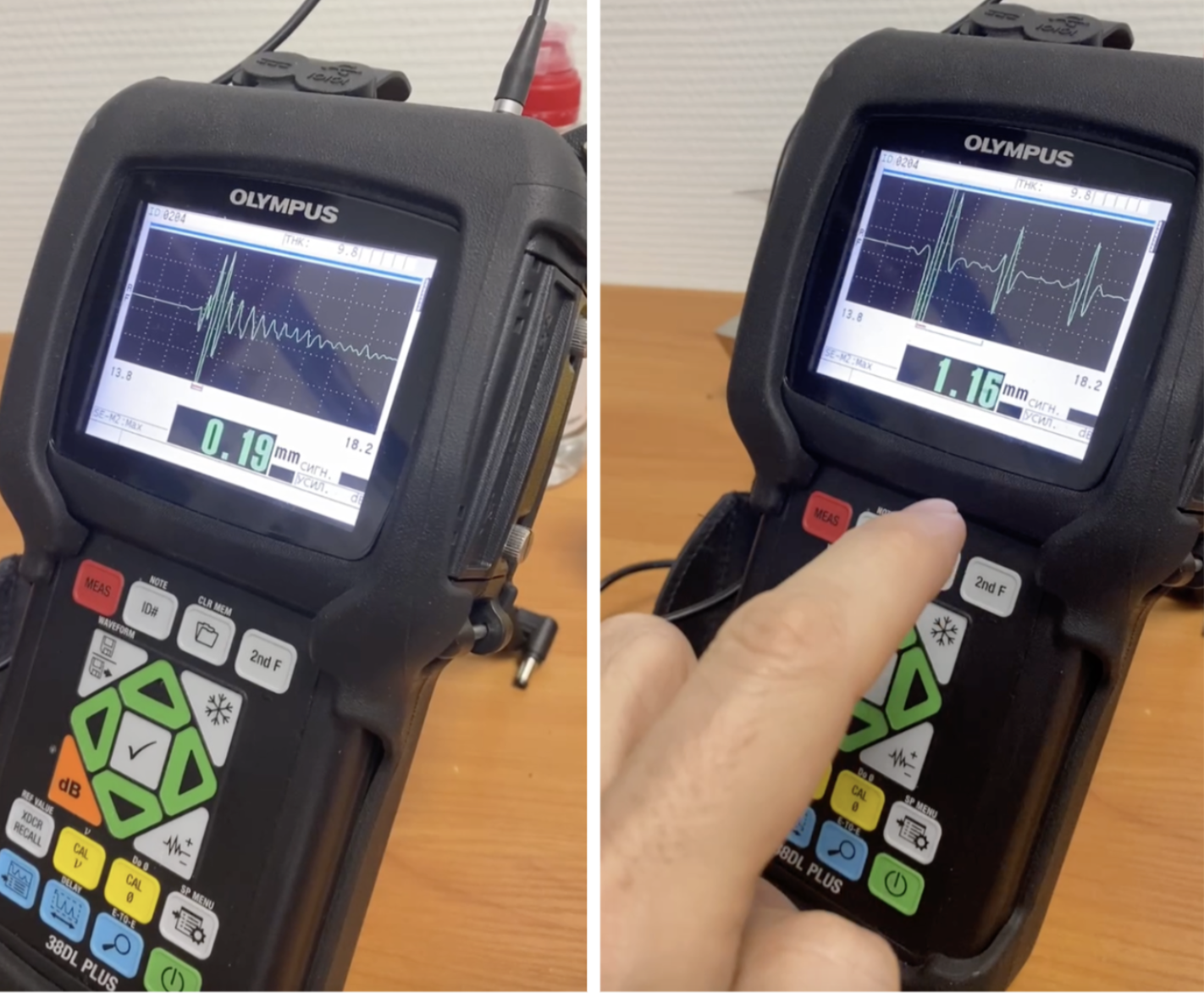 Сначала мы измеряли толщину изделия, потом прислоняли к нему датчик, и в случаях с вставками, кривая на экране прибора показывала неоднородность материала и толщину покрытия до вставки, а не общую толщину изделия.