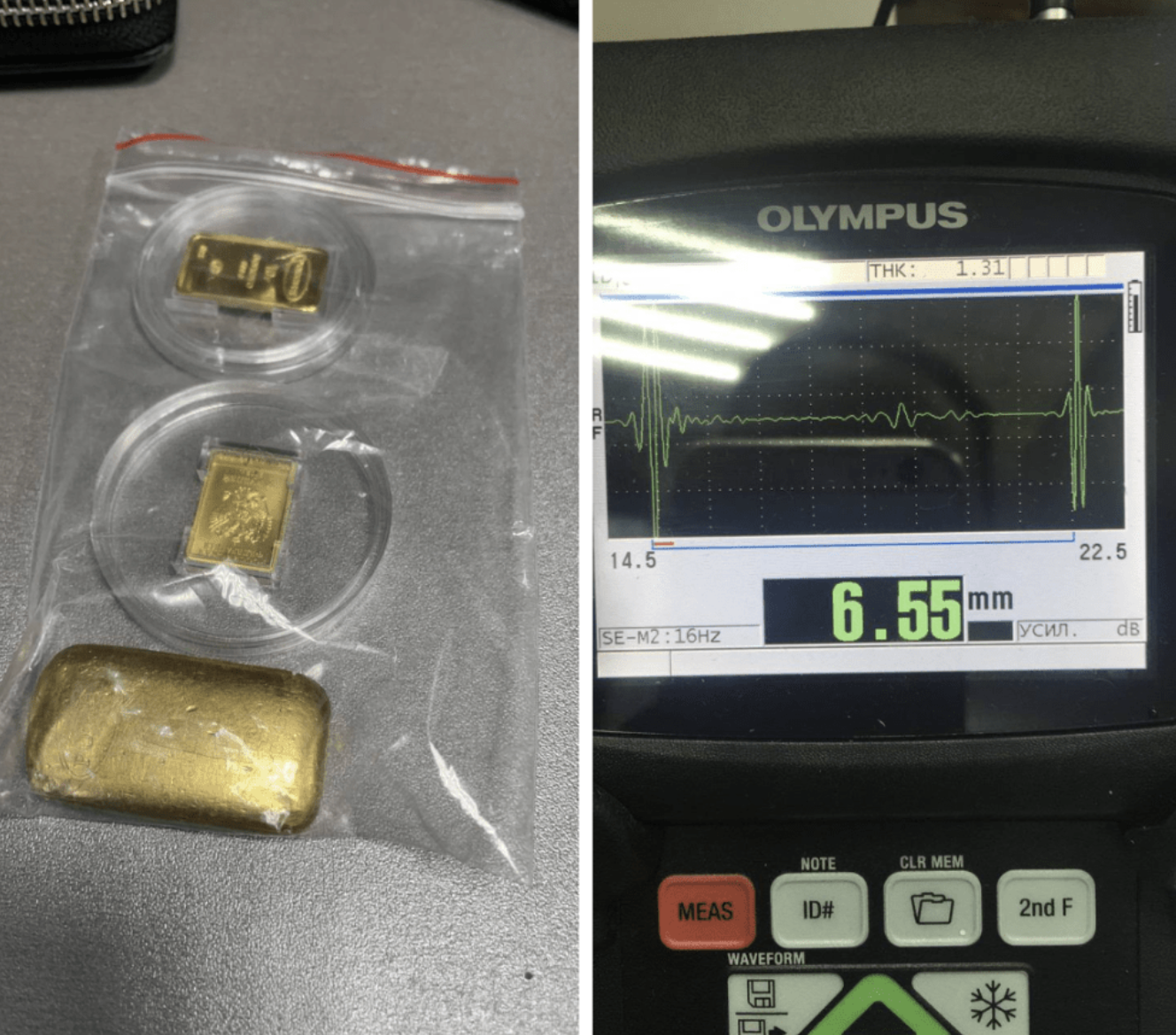 Чтобы победить эту проблему, я нашел в интернетах прибор — спектрометр. Продавец честно признался, что спектрометры делу не помогут, так как пробивают лишь на несколько микрон вглубь изделия. Однако, он же рассказал, что находил вставки в золотых слитках с помощью ультразвукового толщиномера. Тоненькие колечки – это, конечно, не слитки, надо было тестировать. Я взял свою коллекцию подделок и поехал на другой конец Москвы.