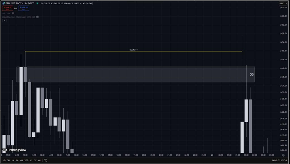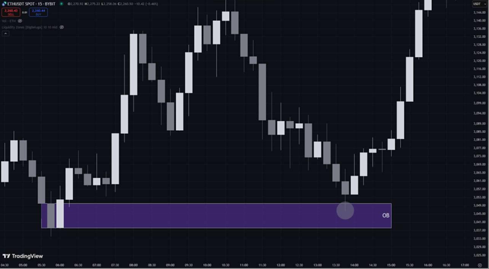 Order Block (OB). Order Block формализуется как последняя свеча противоположного направления перед сильным импульсным движением, которое приводит к слому структуры (BoS/CHoCH). Алгоритмически, это свеча, в диапазоне которой наблюдалась высокая концентрация ликвидности, оцененная через метрику L(p,Δ,t) или через аномальный объем.