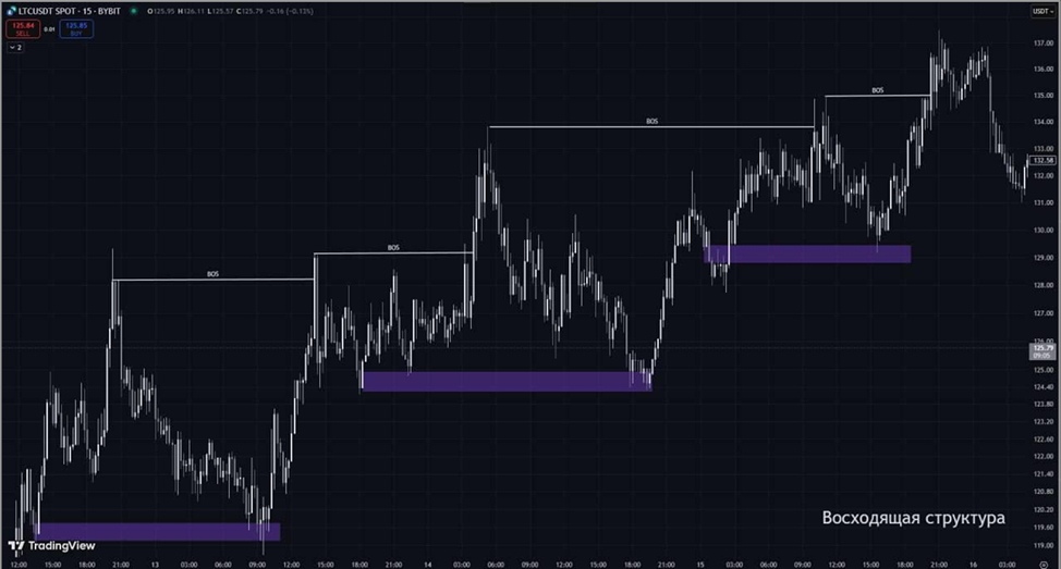 Обновление локального максимума или минимума внутри структуры. Если структура восходящая, то BOS будет обозначаться на локальных хаях и каждое их обновление будет сигнализировать о продолжении текущего тренда (структуры).