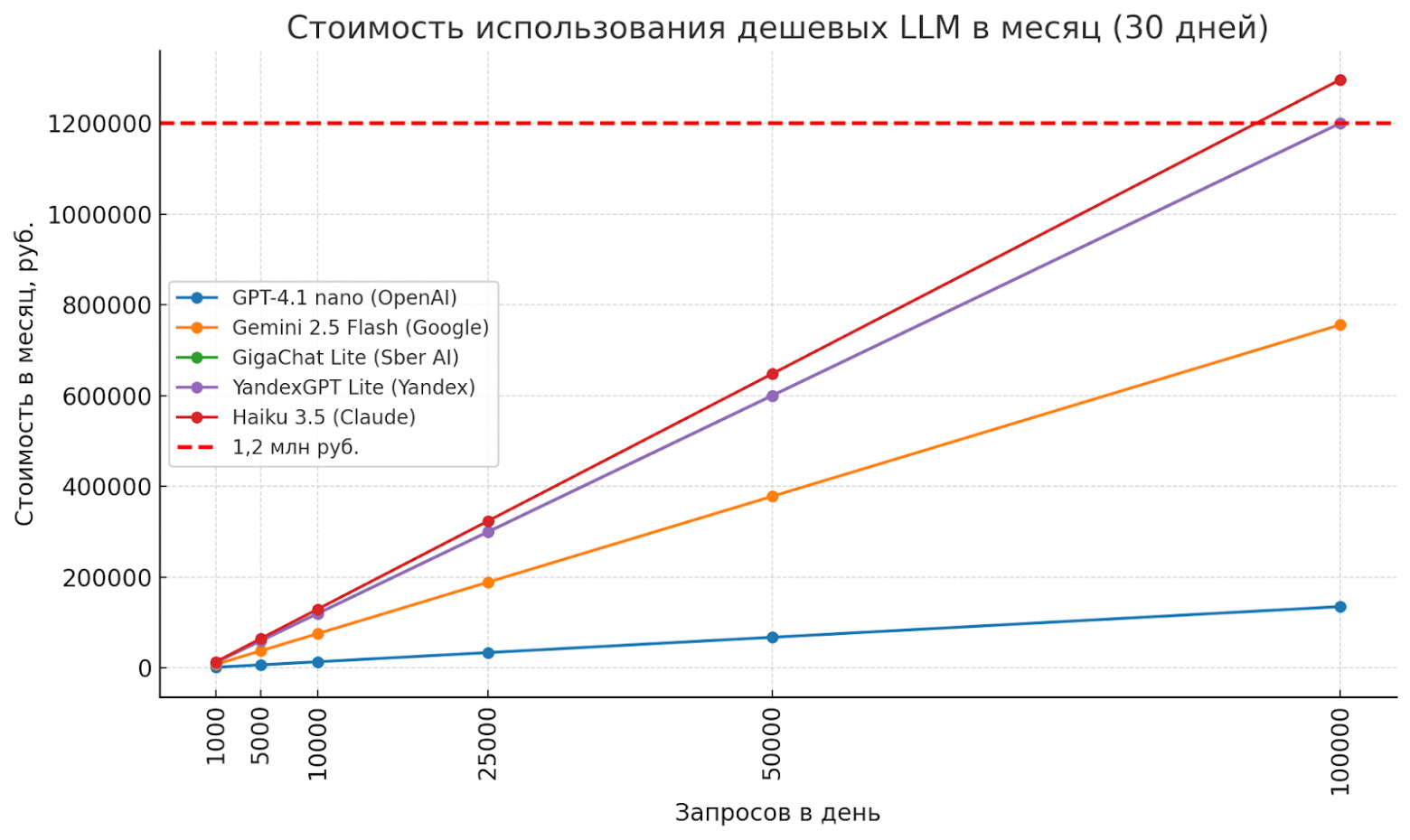 При объемах в 2000 токенов на запрос и 5000 запросов в день — использование модели по API дешевле собственного сервера, даже при использовании топовых моделей.