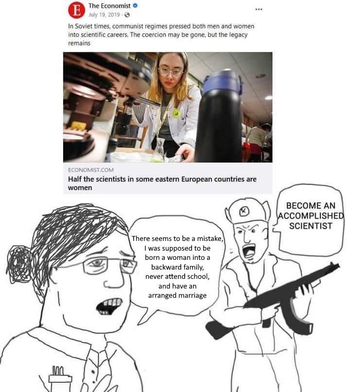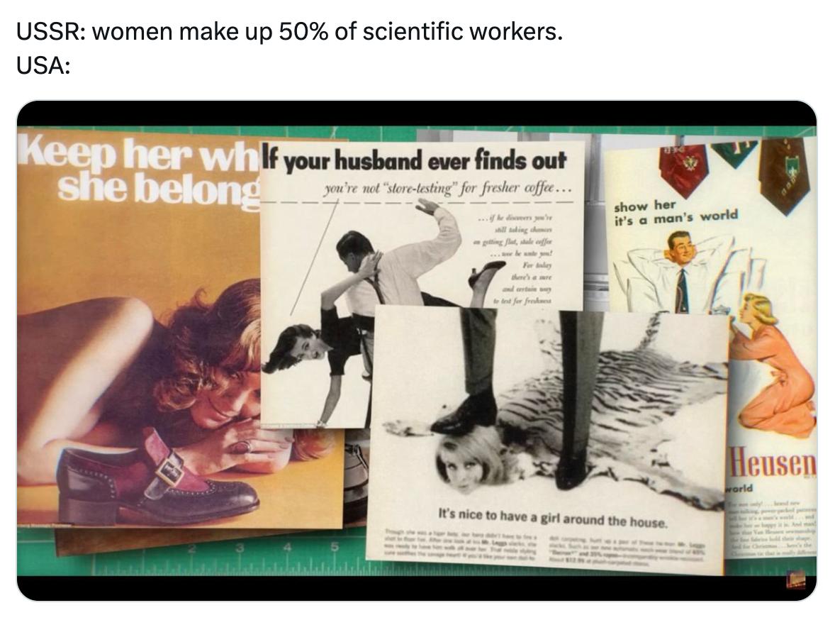 В одном абзаце The Economist превратил прогрессивную гендерную государственную политику в пример коммунистической тирании — а в результате начисто стёр субъектность всех женщин, работавших в науке в советское время — оказывается, их просто заставили, и работа в науке сегодня — это всего лишь привычка.