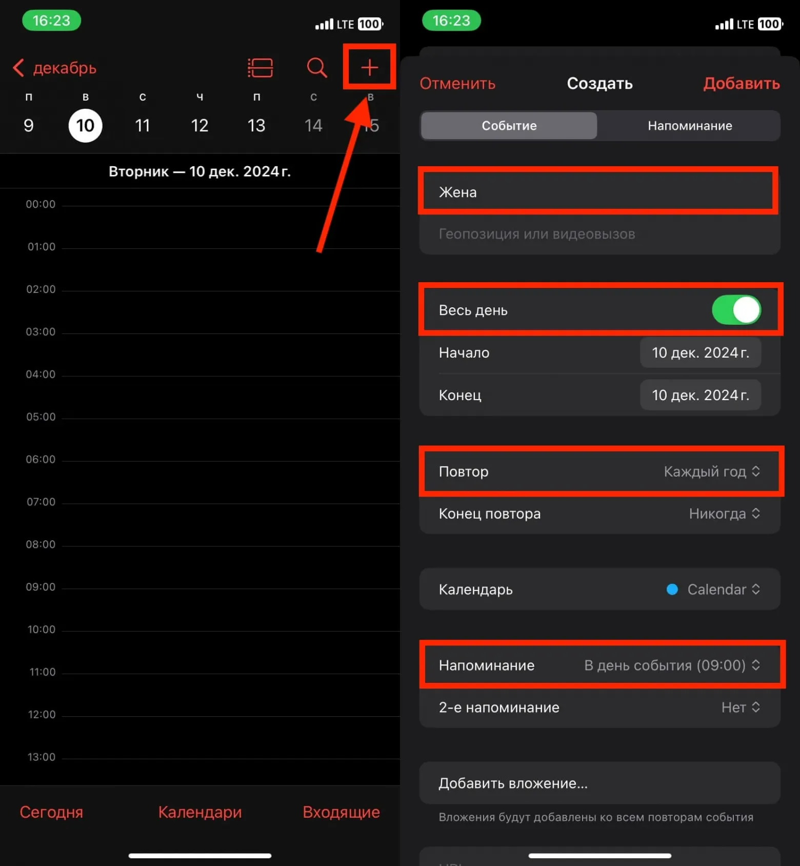 • Сохраните изменения — дата автоматически появится в календаре «Дни рождения».