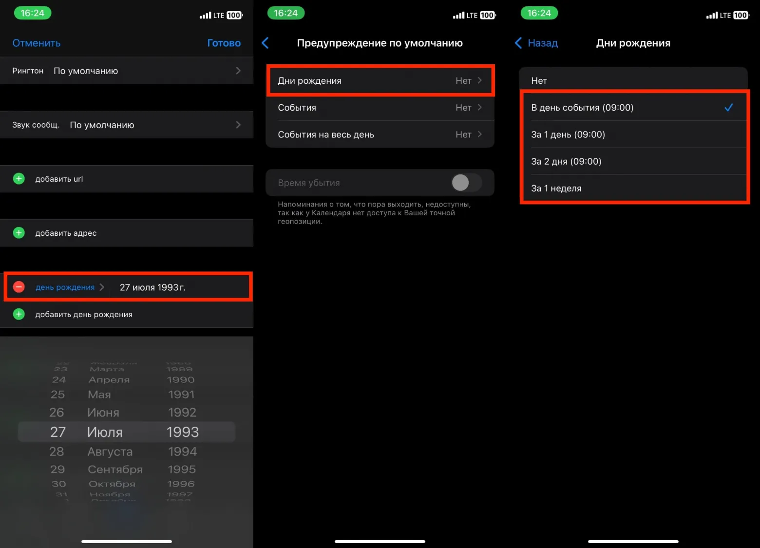 Теперь перейдите в Настройки, откройте раздел «Календарь» и найдите пункт «Предупреждения по умолчанию». Там выберите, когда получать напоминание о днях рождения. Например, за два дня. Работает стабильно, уведомления не мешают, и их можно отключить в любой момент.