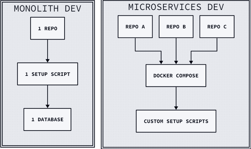 Но вот приход в команду нового фронтенд-разработчика, у которого на рабочем ноутбуке стояла Windows, привёл к кошмару. Ему приходилось запускать аж десять контейнеров, чтобы просто увидеть свой UI. При этом всё постоянно ломалось — то тома, то сеть, то проблемы с совместимостью контейнеров — и сама конфигурация была очень плохо задокументирована. Всё это создало немало трений в процессе онбординга.