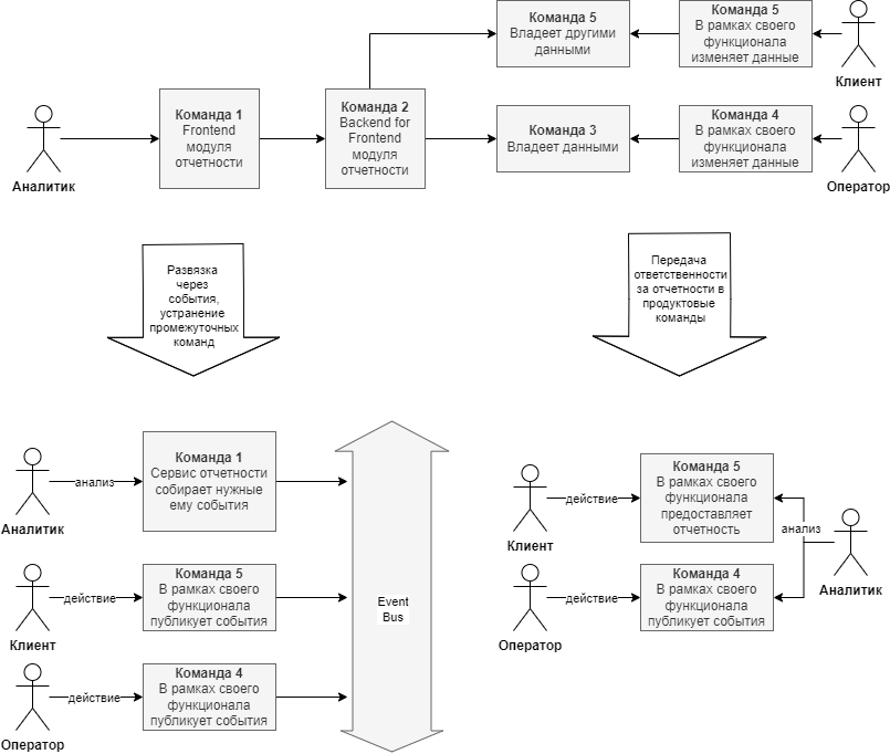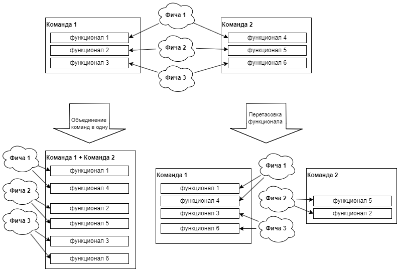 В самом простом варианте такая «смена структуры» будет представлять из себя просто переданный функционал из одной команды в другую. Перераспределение ответственностей между командами даёт большой ресурс по исправлению архитектурных проблем.
