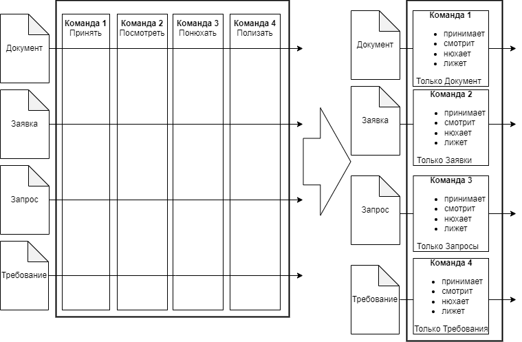 Иногда перераспределения ответственностей или компетенций недостаточно. Например, бывают организации, где все подразделения делают, по сути, один и тот же продукт, но каждое крутится вокруг своего конкретного клиента/рынка. В целом, идея выделить команду под группу клиентов — нередко очень правильная, например, в очень многих бизнесах физлица, юрлица и сотрудники имеют слишком разный функционал, чтобы игнорировать это при разделении.