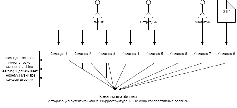 Другая проблема, которая всплывает в глубокой архитектуре — это взаимозависимость команд. Если вашей команде для реализации вашего функционала нужно участие еще десятка команд, которые заинтересованы в своих задачах, то я вам не завидую. По сути, здесь работает та же логика: с какой-то частотой вашу работу будет блокировать та или иная команда по своим внутренним причинам. Чем больше команд, от которых вы зависите, тем больше времени ваша команда будет ждать, прежде чем сможет решить поставленную проблему.