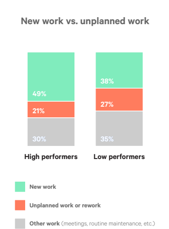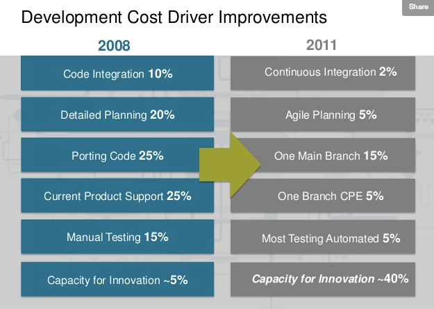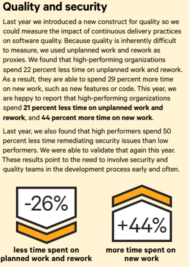 Позже, имея в виду этот кейс, исследователи из State of Devops обнаружили, что средние цифры все же несколько отличаются: сильные организации умудряются обычно тратить даже больше времени на новые фичи — до 50% в среднем. А если это средние цифры, то надо понимать, что есть даже те, у кого дела ещё лучше. То есть, у HP LaserJet был еще запас, куда расти, и могло быть даже не 8 раз, а больше 10.