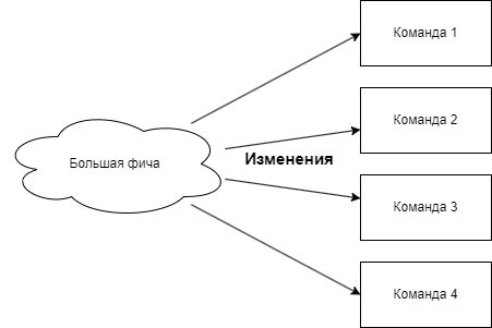 Иногда одна команда для другой является посредником, и тут все расписано выше. Иногда обе команды работают в параллель, и новая фича это почти всегда изменения в 2 командах.
