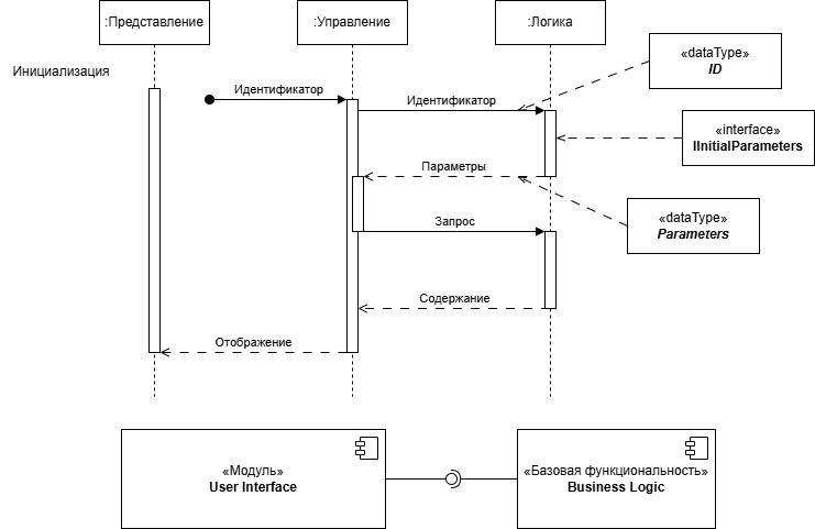 Вернемся к диаграмме. Обозначим идентификатор и набор параметров как типы данных, метод который извлекает параметры как интерфейс. Такие же операции проведем над остальными диаграммами последовательности из предыдущий статьи и получим абстрактную модель базового модуля.