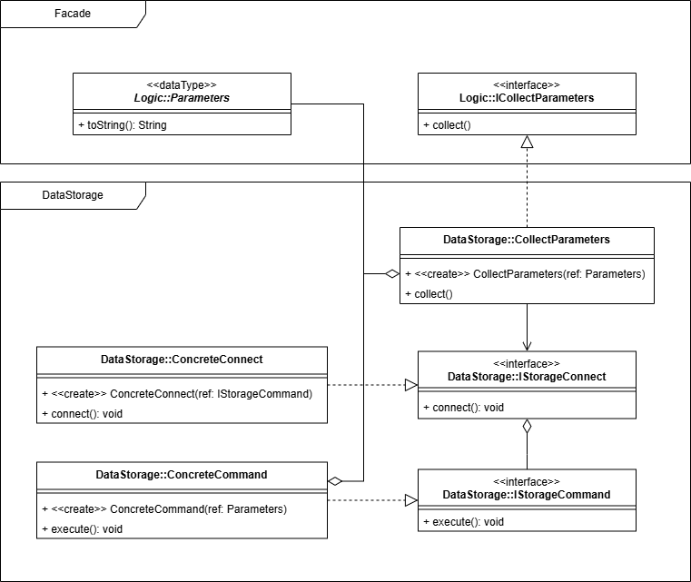 В таких случаях необходимо опуститься на уровень модуля и ввести некоторые ограничения на внутреннюю структуру модуля. В нашем примере необходимо добавить еще две абстракции, одна из которых отвечает за особенности подключения к хранилищу данных, а вторая за возможность добавления новых команд.