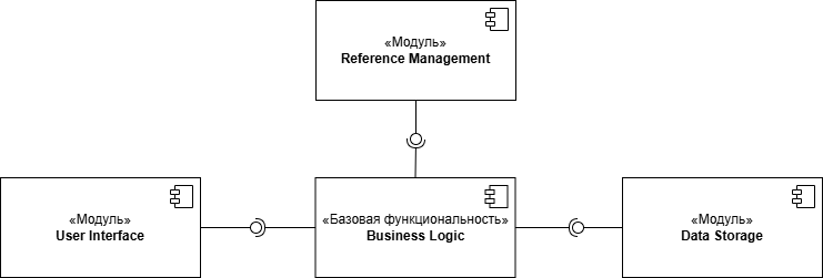 Вернемся к нашей диаграмме, рассмотрим левую часть и организуем взаимодействие модулей. Как написано выше, модуль базового функционала является основным по отношению к другим. Вероятность изменения бизнес-процессов намного меньше чем вероятность изменения интерфейса. Именно по этому выбран такой приоритет. Следовательно, базовый должен иметь абстракции с помощью которых подключаются другие.