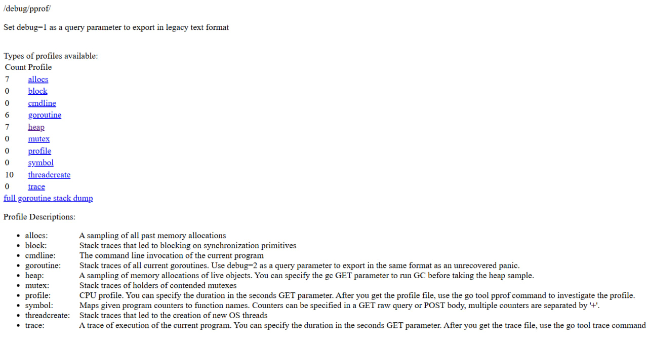 Это самый простой способ. Вы можете просто открыть в браузере один из эндпоинтов, которые зарегистрировал pprof. Например, http://localhost:8080/debug/pprof/heap. Вы увидите текстовое представление данных, которое удобно для быстрой оценки, но не для глубокого анализа.