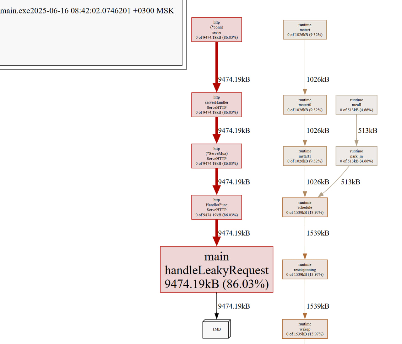 Вывод top однозначно указывает на main.handleLeakyRequest как на источник проблемы — на нее приходится 77.59% выделенной памяти (почти 3.47MB в моем случае).