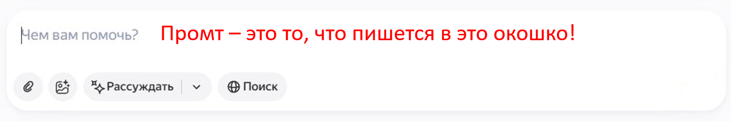 Промт — это ваше сообщение (вопрос, просьба, задача) для большой языковой модели. Это то, что вы пишите в окно чата перед тем, как бот выдаёт ответ.