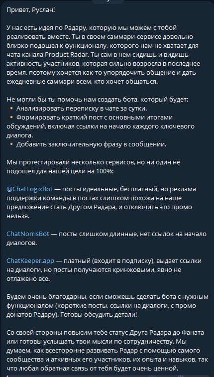 Я согласился, потратил время, — пришлось расширить архитектуру и добавить типовые запросы, но получилось неплохо. Система на чатах Радара обкаталась и заработала, на короткое время.