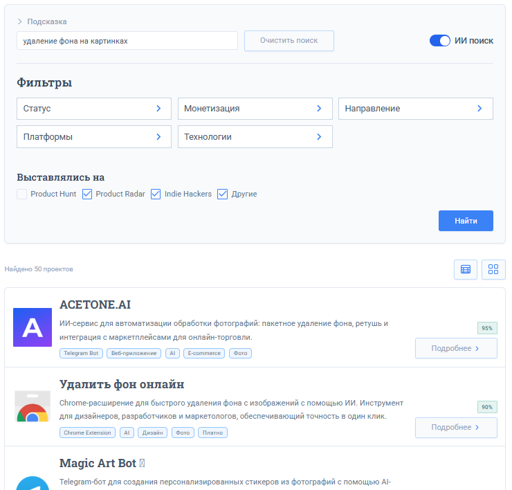 И стало понятно, что проблема не в полезных приложениях — они есть; проблема в том, чтобы найти их. И пришла идея сделать каталог продуктов с ИИ поиском по нему. Чтобы написал: «убрать фон с картинки«, и она выдала релевантные предложения.