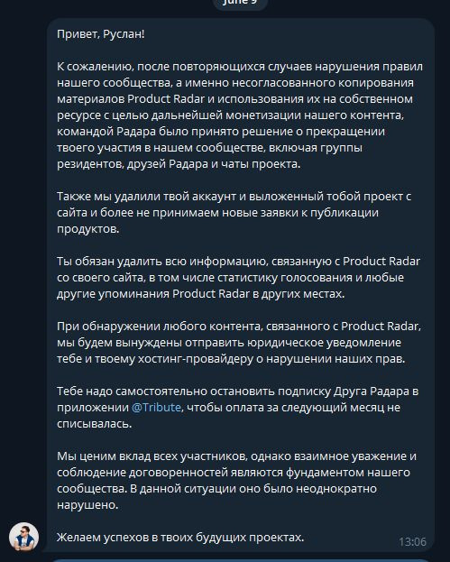 Сегодня в 12:00 MSK на productradar.ru должен был запускаться мой проект startup-tools.ru. Вместо этого я получил две недели назад от владельца PR Дмитрия Беговатова обвинения в воровстве, оскорбления и вечное изгнание с платформы.
