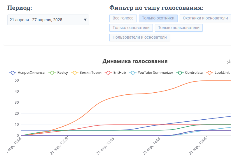 Один голос охотника идет за пять голосов пользователей. Но в данном случае в первые два часа нагнали и пользователей, — причем, в несколько раз больше числа реальных пользователей продукта (если они вообще есть). Нужно сказать, что большинство охотников имеет свои ТГ каналы и иные источники трафика, и активно используют их для привлечения голосов на PR.
