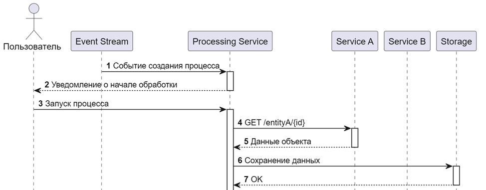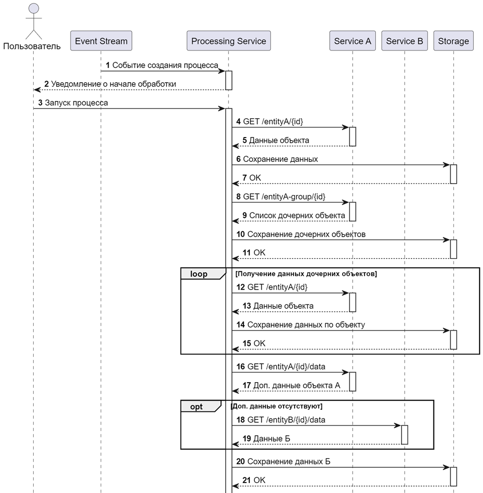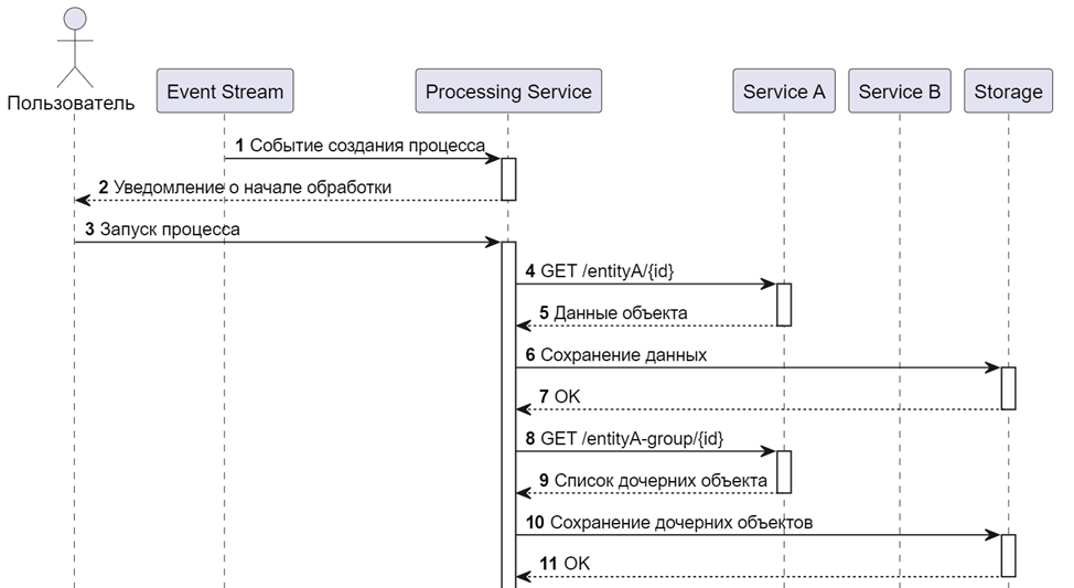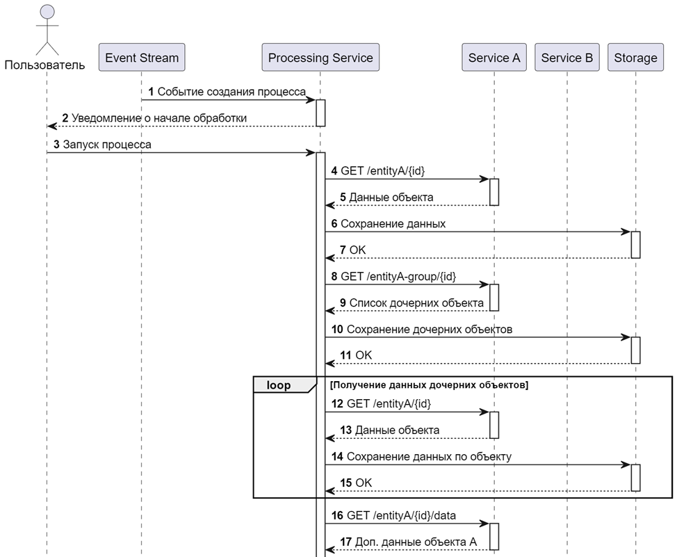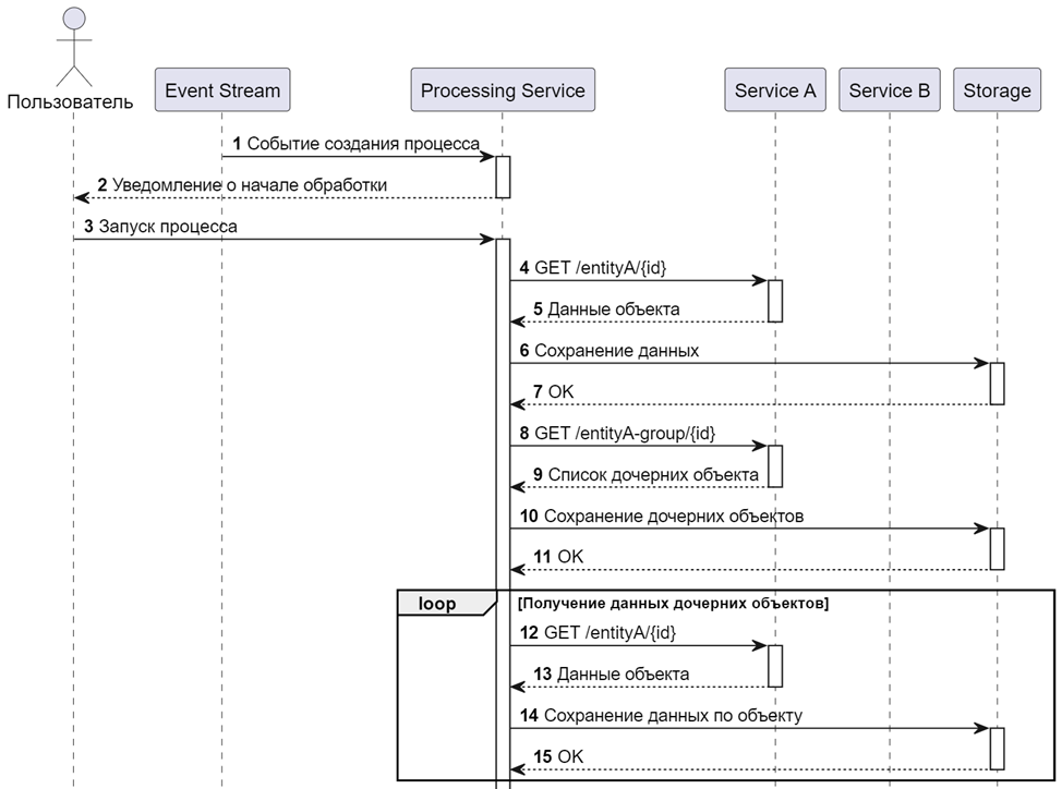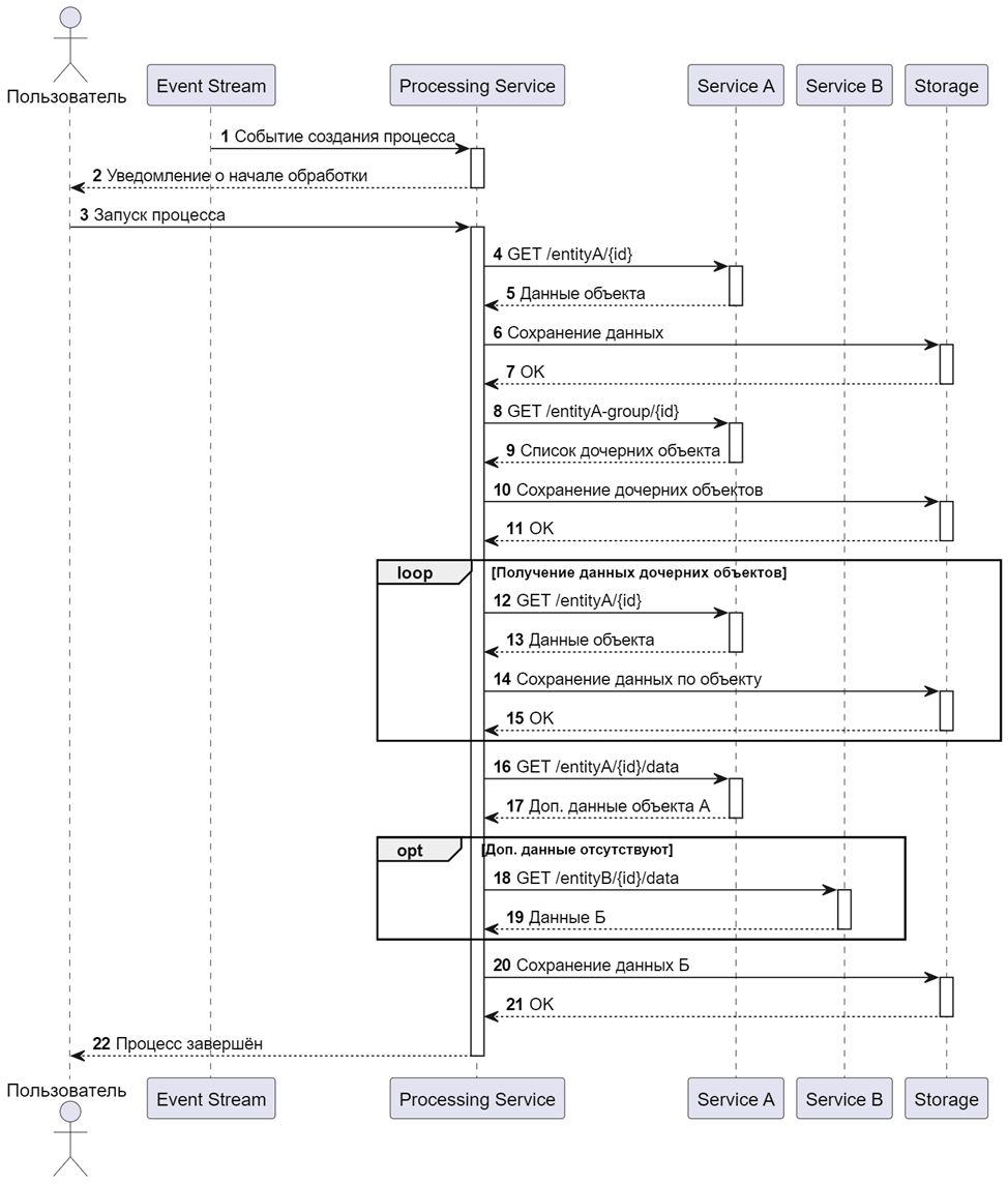 Процесс начинается с получения нашей системы сообщения из топика. Сообщение обрабатывается, после чего пользователь получает уведомление. После этого он вручную запускает основной процесс. Система запрашивает данные объекта типа A у внешнего сервиса A и сохраняет их во внутреннее хранилище. Далее осуществляется запрос списка дочерних объектов, таких как подчинённые элементы, вложенные сущности или связанные документы, которые также сохраняются. После этого каждый дочерний объект обрабатывается индивидуально: для каждого выполняется отдельный запрос, и результат сохраняется. Затем сервис делает запрос на получение дополнительных данных по объекту A. Если этих данных нет, выполняется альтернативный запрос во внешний сервис B для получения данных типа B. В финале все собранные данные сохраняются, и пользователь получает уведомление о завершении процесса. Всё взаимодействие между компонентами визуализируется с помощью диаграммы последовательности UML, позволяющей чётко отследить порядок действий и участников.