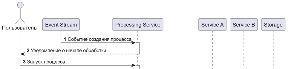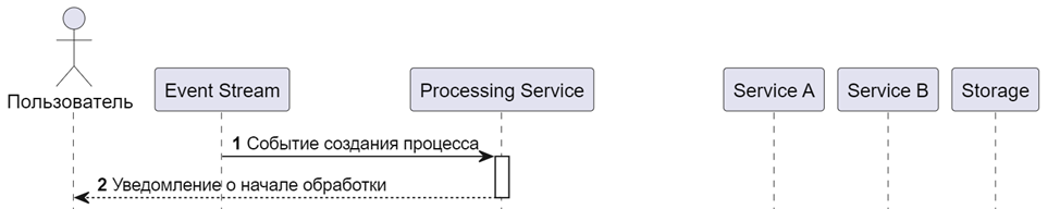 Внешняя система отправляет сообщение о создании процесса в топик Kafka. Наша система получает сообщение и уведомляет пользователя о начале процесса, это первый шаг на диаграмме: