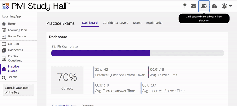 На гифке выше — та самая фича «Chill out and take a break» из PMI Study Hall. Если честно, я до сих пор думаю, как продакт это защищал на питче и какую метрику она должна улучшать. Ну хотя бы приятно, что в процессе страдания кто-то предлагает передохнуть.