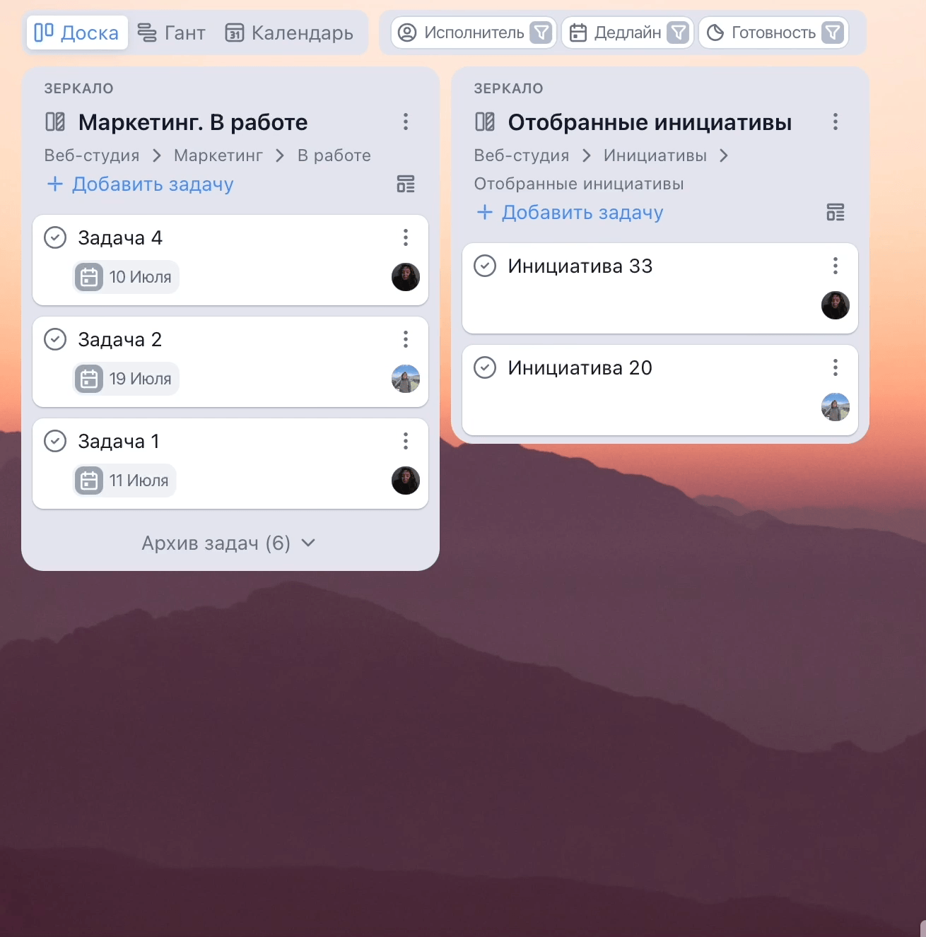 Руководитель может настроить процесс, чтобы наблюдать за самыми важными задачами в разных отделах. Для этого необязательно переходить из доску на доску ― можно настроить зеркальное отображение нужных колонок на новой доске, скрытой ото всех остальных.