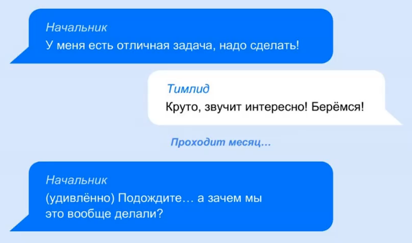 Это случай из моей практики, я тогда ещё не был тимлидом. Наслушавшись идей начальника, я, окрылённый, побежал их реализовывать. Спустя некоторое время начальник меня спросил: «А зачем мы всё это сделали?» Это был очень важный для меня урок.